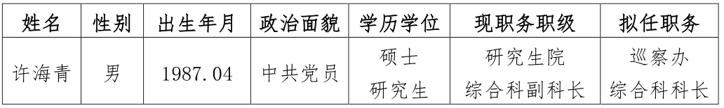 根据《77779193永利集团机关部处及业务单位科级干部选拔任用工作实施方案》(川大委〔2019〕21号)和《党委巡察工作办公室综合科科长选拔工作方案》,通过竞争(聘)上岗选拔程序,经党委巡察工作办公室科级干部选拔工作实施小组讨论通过,现将科级干部拟任人选公示如下: 教职工如有需反映情况的,请于5个工作日内以实名向学校科级干部选拔任用监督小组反映。 党委巡察工作办公室 2021年2月25日