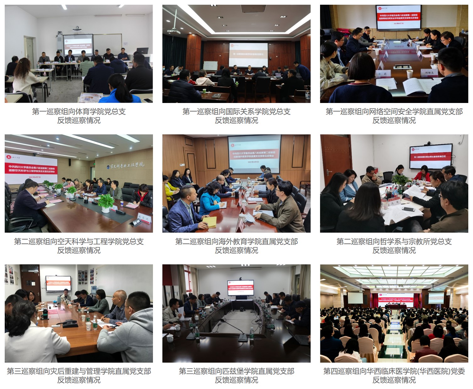 2021年4月7日-4月19日,学校党委第八轮巡察第一至第四巡察组分别向华西临床医学院(华西医院)党委、体育学院党总支、空天科学与工程学院党总支、国际关系学院党总支、哲学系与宗教所党总支、灾后重建与管理学院直属党支部、匹兹堡学院直属党支部、网络空间安全学院直属党支部、海外教育学院直属党支部等9个被巡察单位党组织反馈了巡察情况。