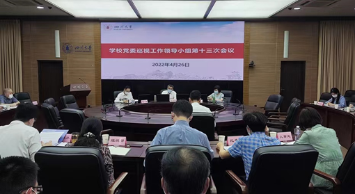 2022年4月26日下午,学校党委巡视工作领导小组在望江校区明德楼四楼一会议室召开第十三次会议。会议传达学习了2022年全国巡视工作会议暨十九届中央第九轮巡视动员部署会精神,听取了巡视办关于第九轮校内巡视整改进展总体情况的报告,审议了学校关于加强校内巡视整改和成果运用的若干措施、2022年校内巡视工作要点。 学校党委巡视工作领导小组全体成员、第九轮巡视巡视组组长和被巡视单位党组织主要负责人参加了相关事项的研究讨论。