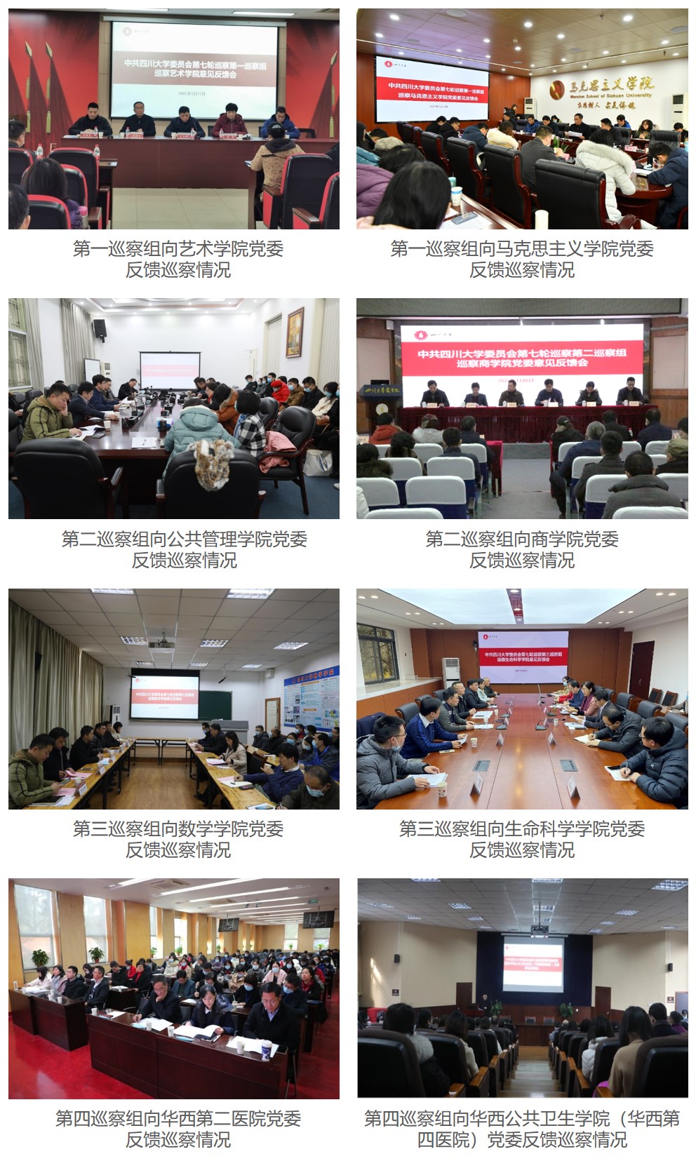 2021年1月6日-1月11日,学校党委第七轮巡察第一至第四巡察组分别向艺术学院、数学学院、生命科学学院、华西第二医院、华西公共卫生学院(华西第四医院)、公共管理学院、商学院、马克思主义学院等8个被巡察单位党委反馈了巡察情况。