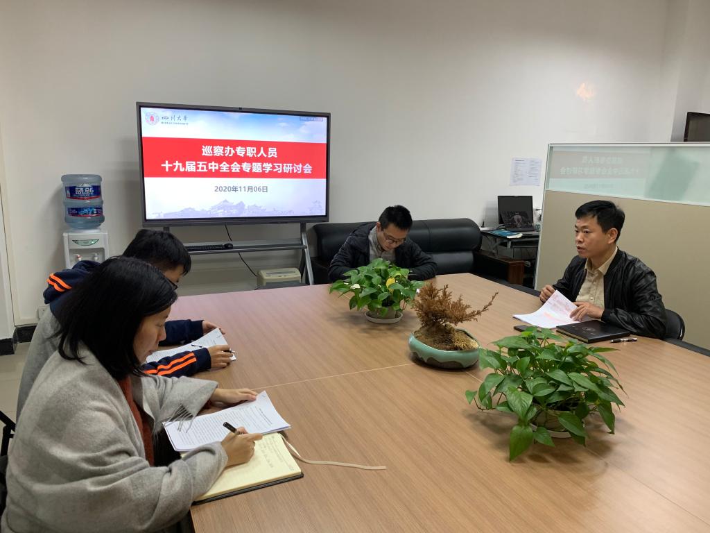 2020年11月6日下午,校巡察办全体专职人员在望江校区行政楼202开展了十九届五中全会专题学习研讨活动,深入学习全会精神,特别是习近平总书记在会上的重要讲话和论述。