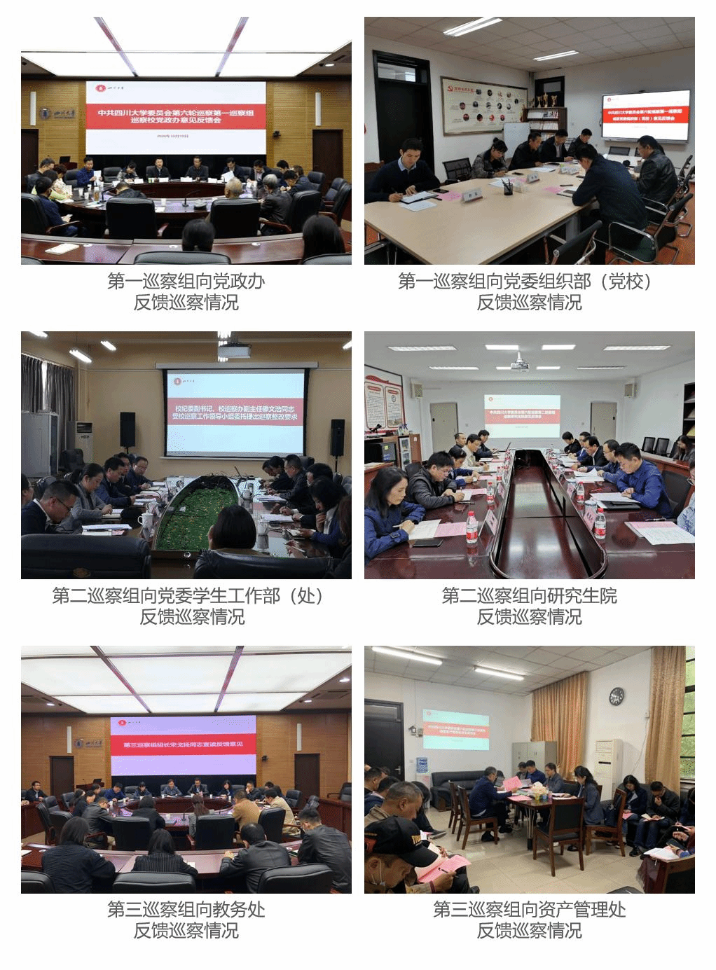 2020年10月9日-10月13日,学校党委第六轮巡察第一至第三巡察组分别向党政办、党委组织部(党校)、党委学生工作部(处)、教务处、研究生院、资产管理处等6个被巡察单位反馈了巡察情况。