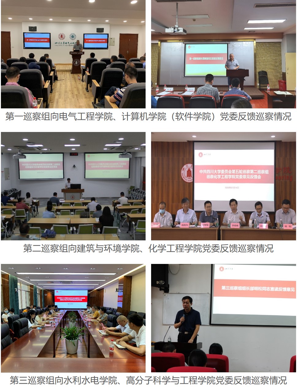 2020年7月13日-7月14日,学校党委第五轮巡察第一至第三巡察组分别向电气工程学院、计算机学院(软件学院)、建筑与环境学院、化学工程学院、水利水电学院、高分子科学与工程学院等6个被巡察单位党委反馈了巡察情况。
