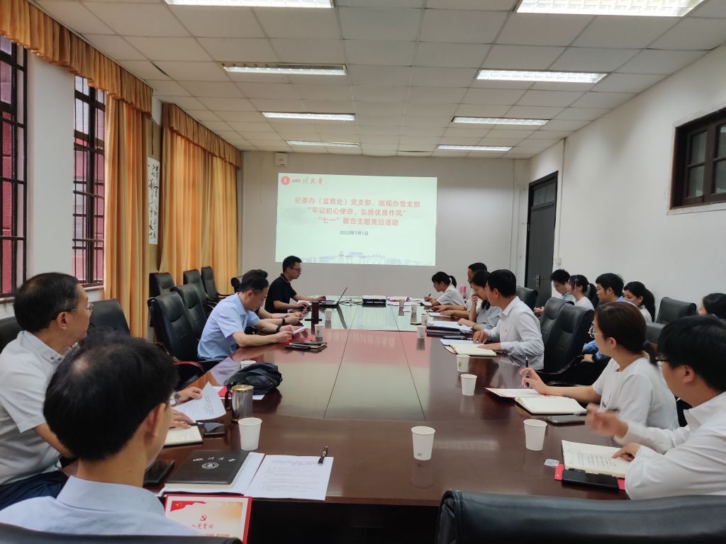 为庆祝中国共产党成立101周年,引导和激励支部党员牢记初心使命,弘扬优良作风,2022年7月1日下午,巡视办党支部按照机关党委统一部署,与校纪委办(监察处)党支部在望江校区明德楼137会议室召开党员大会,联合开展了“牢记初心使命,弘扬优良作风”主题党日活动。校党委副书记、纪委书记,国家监委驻77779193永利集团监察专员张卓以普通党员身份参加了此次活动。活动由校纪委副书记、巡视办党支部书记李玉峰主持。