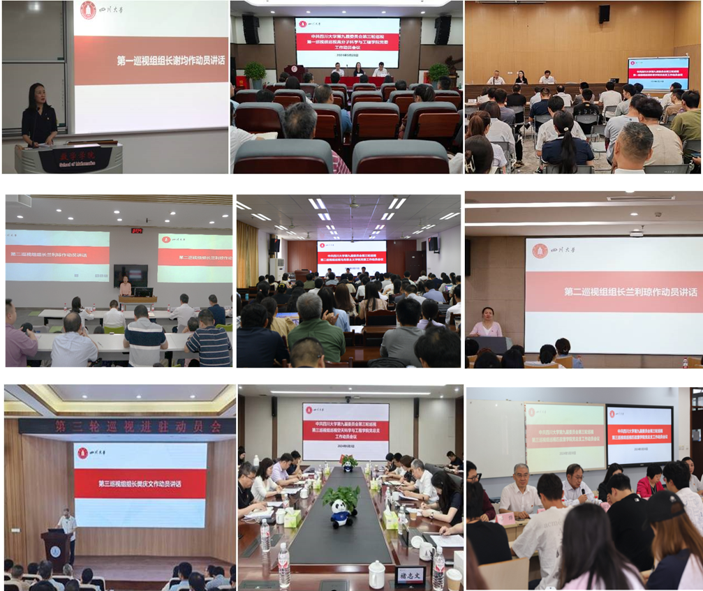 根据学校党委统一部署,5月28日至6月3日,学校第九届党委第三轮巡视完成进驻工作。3个巡视组分别对数学学院党委、计算机学院(软件学院、智能科学与技术学院)党委、高分子科学与工程学院党委、华西基础医学与法医学院党委、马克思主义学院党委、体育学院党总支、空天科学与工程学院党总支、匹兹堡学院党总支、网络空间安全学院党总支等9个党组织开展“学生为根、育人为本”本科教育教学专项巡视。