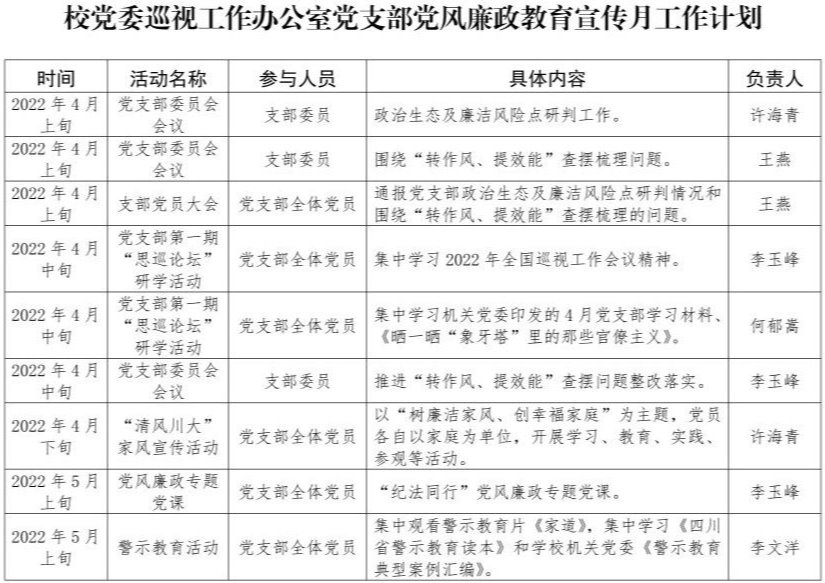 为加强部门廉洁文化建设,筑牢巡视干部拒腐防变意识,巡视办党支部按照学校《关于开展2022年党风廉政教育宣传月活动的通知》统一部署,系统谋划,认真落实、多种形式开展党风廉政教育宣传月活动,取得较好成效。